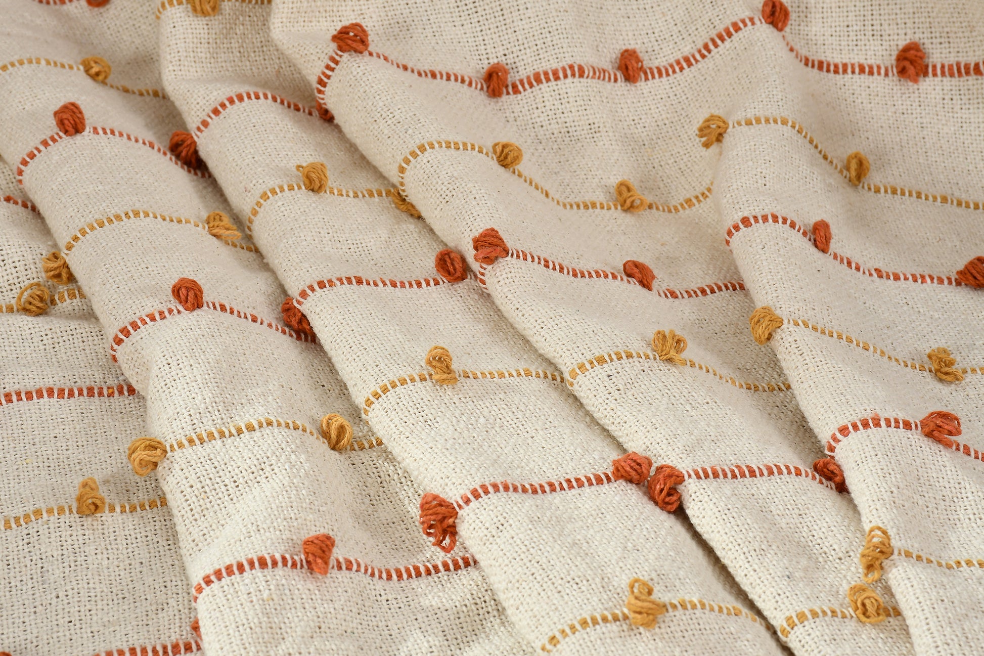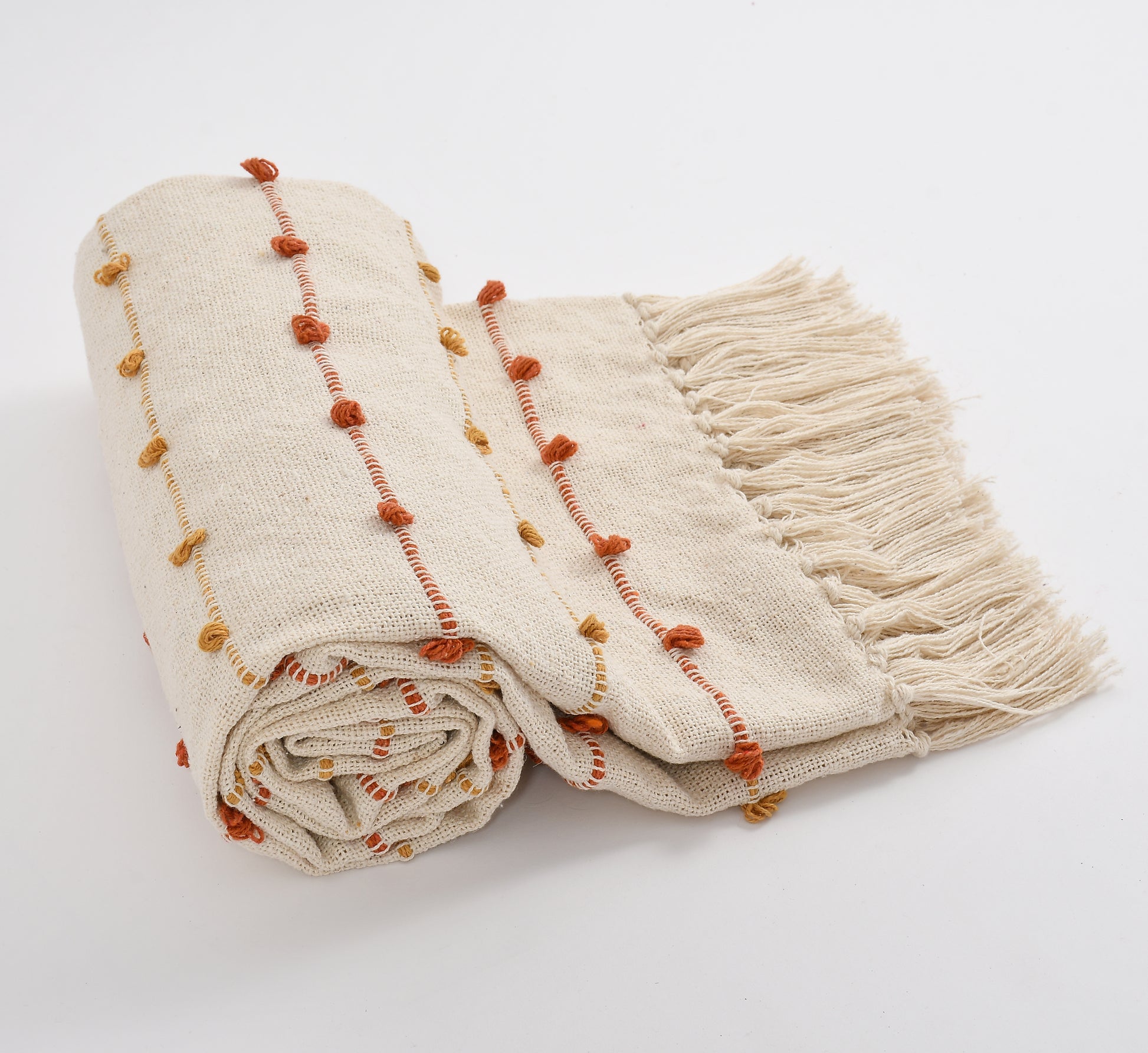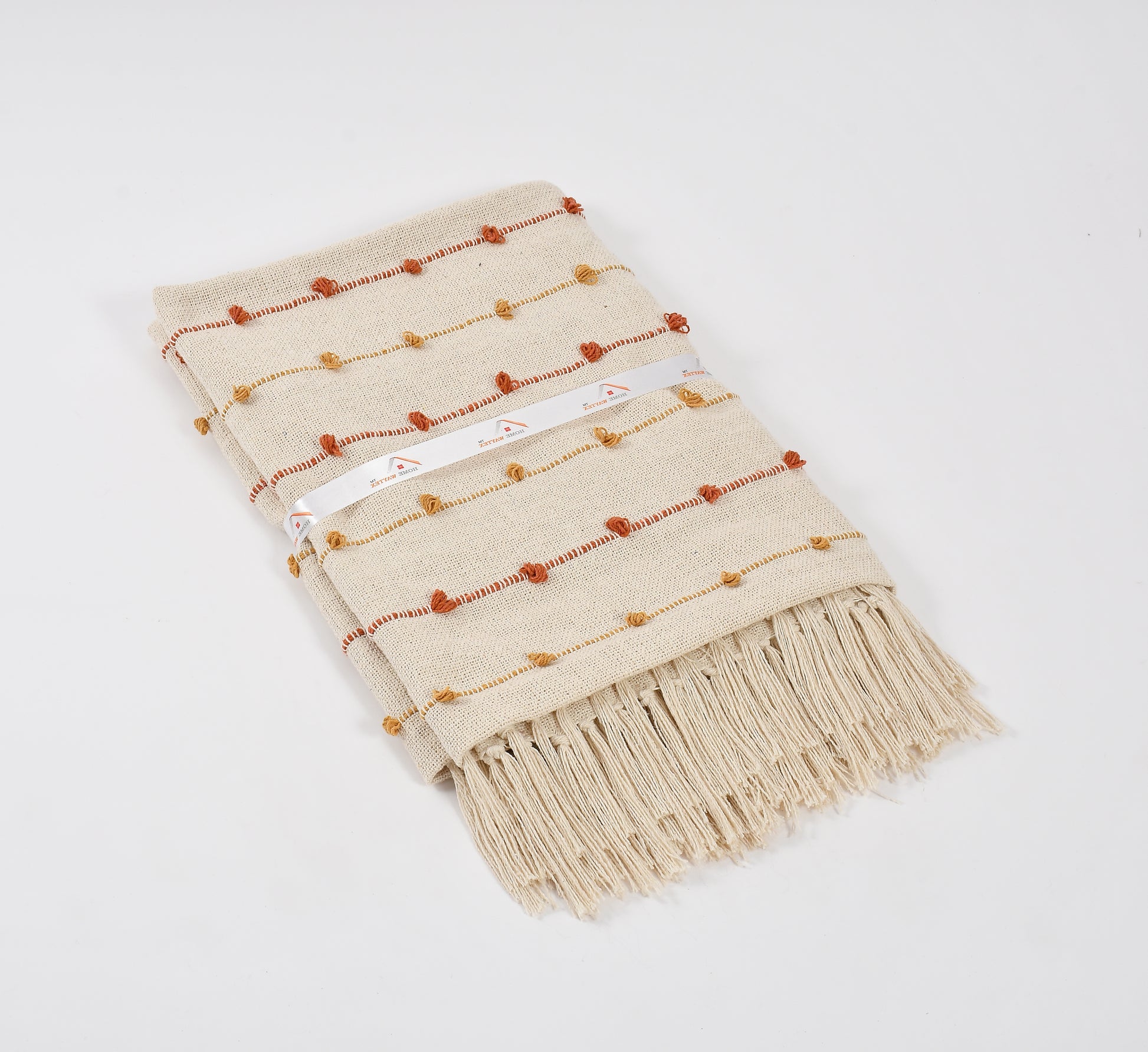 Amber Lines is a warm, tactile celebration of traditional craftsmanship. This premium 100% cotton handwoven throw is delicately accented with mustard and rust-toned tufts woven in rhythmic, minimal rows. Finished with soft hand-knotted fringes, it offers just the right touch of cozy texture to elevate any neutral space. Drape it over your reading nook, bed, or favorite armchair — it's where comfort meets artisanal charm.