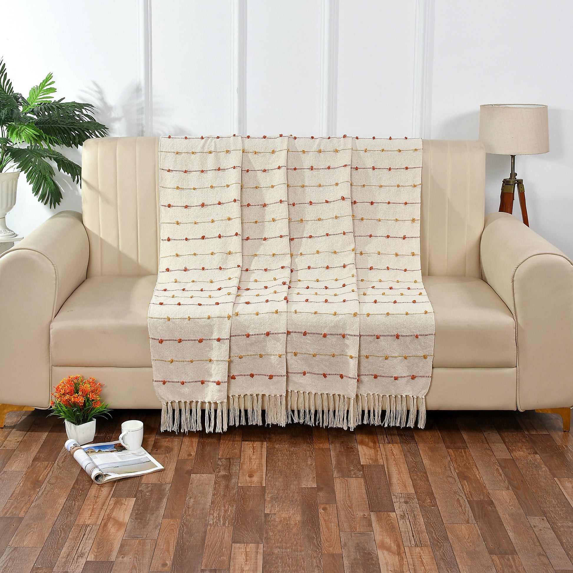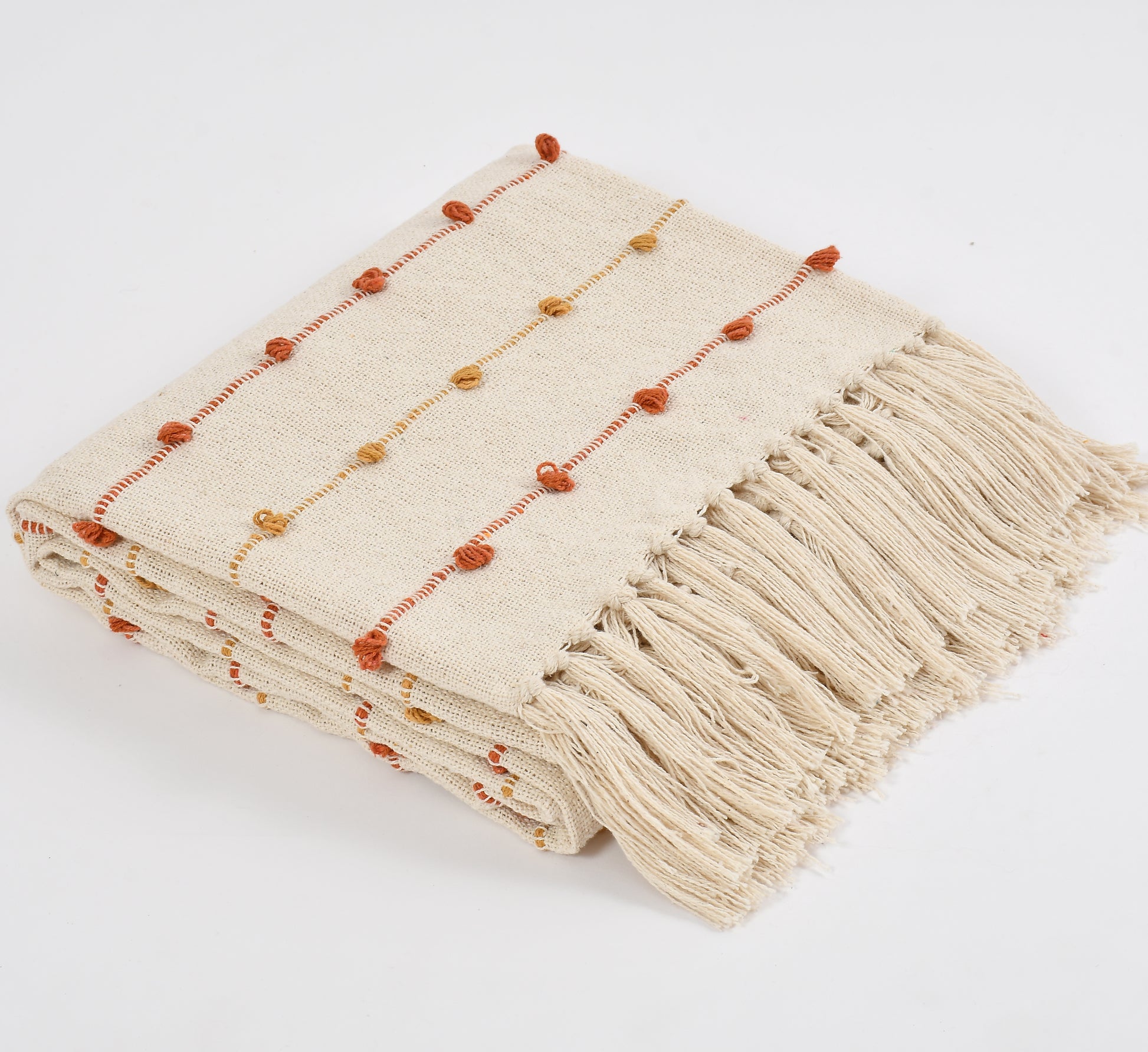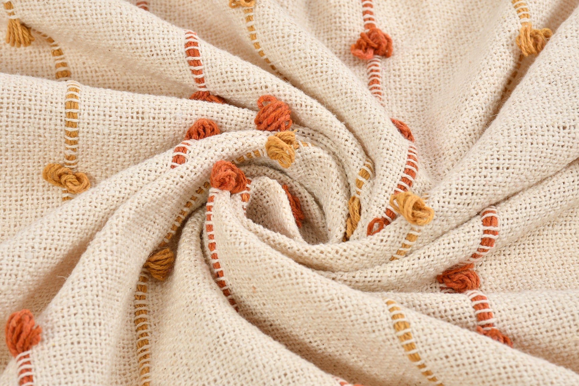 Amber Lines is a warm, tactile celebration of traditional craftsmanship. This premium 100% cotton handwoven throw is delicately accented with mustard and rust-toned tufts woven in rhythmic, minimal rows. Finished with soft hand-knotted fringes, it offers just the right touch of cozy texture to elevate any neutral space. Drape it over your reading nook, bed, or favorite armchair — it's where comfort meets artisanal charm.