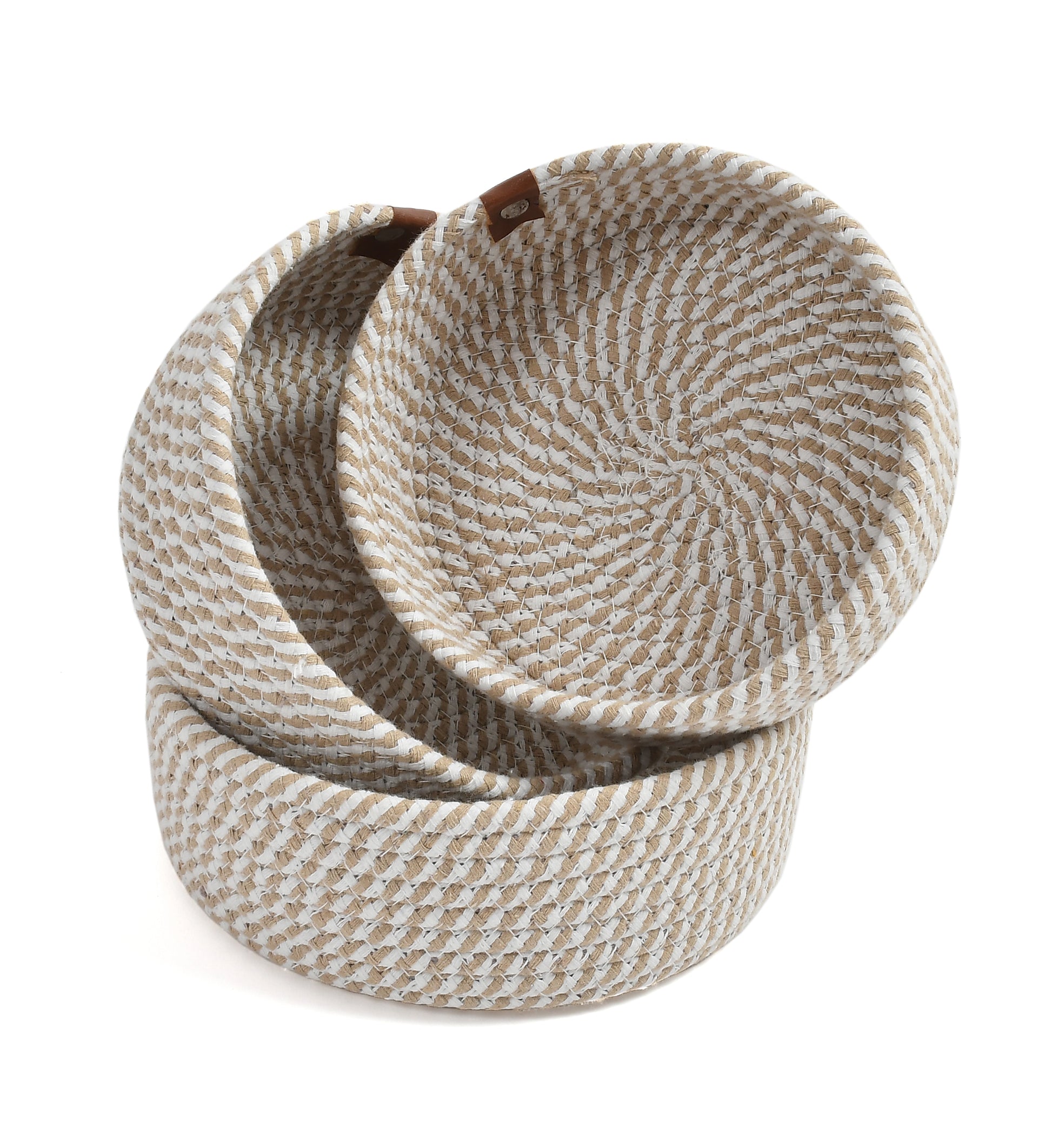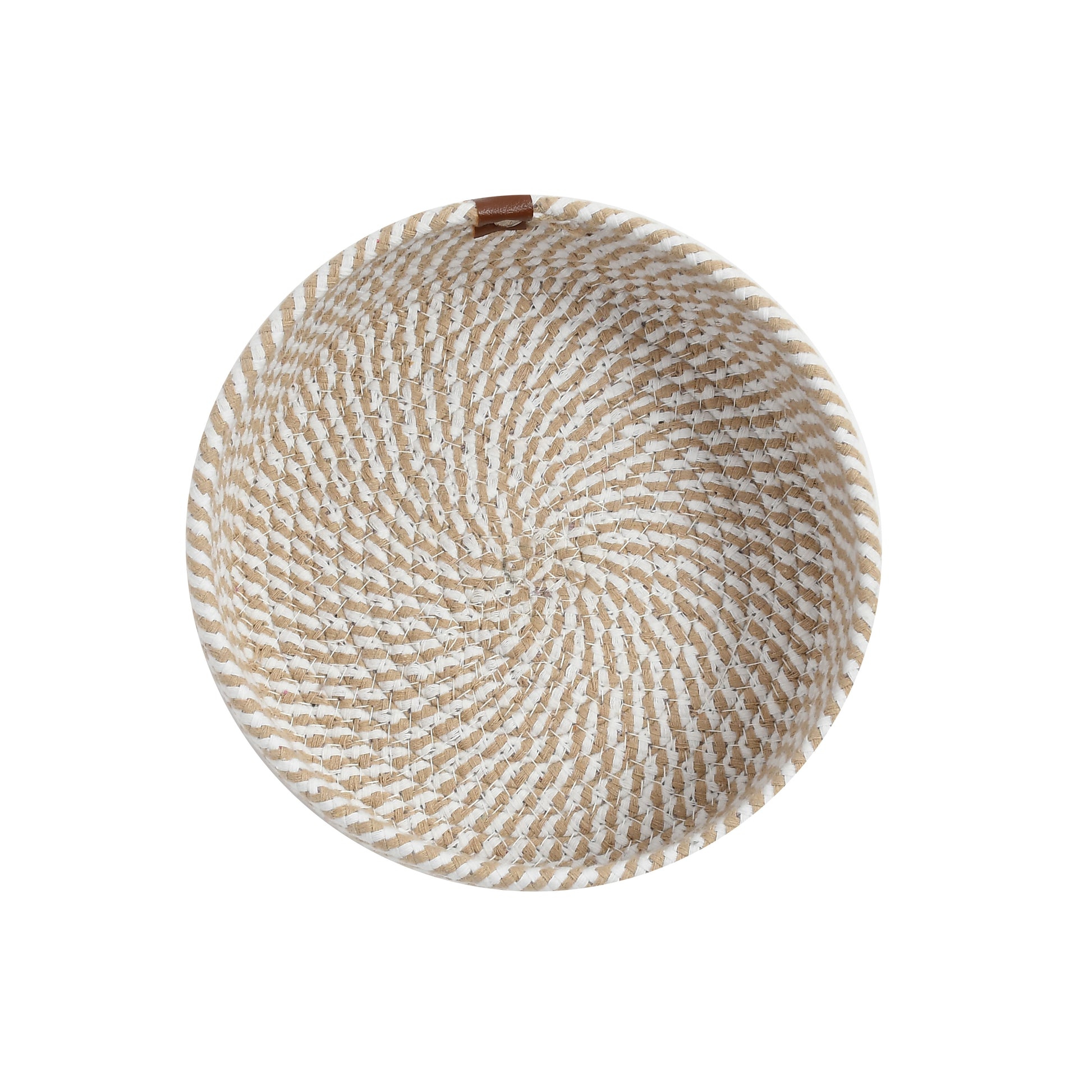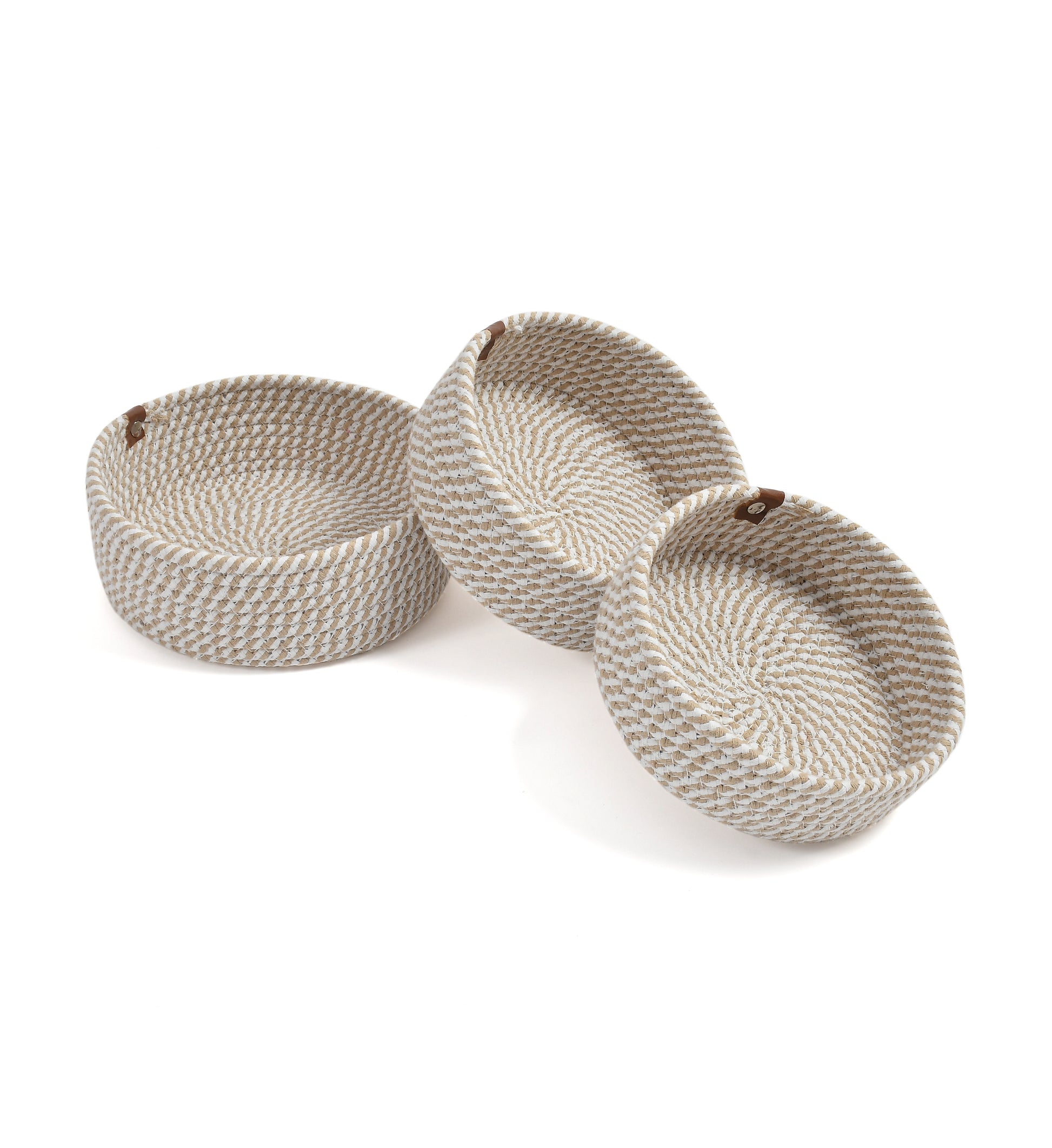 Earthy tones with beige and white accents. Thoughtfully handwoven by artisans in India, these versatile catch-alls are perfect for storing everything from bathroom essentials to entryway trinkets. Compact yet sturdy, they add organic texture to any surface — bedside, kitchen, or desk. Style them solo or as a set to bring subtle pattern and function into your daily rhythm.