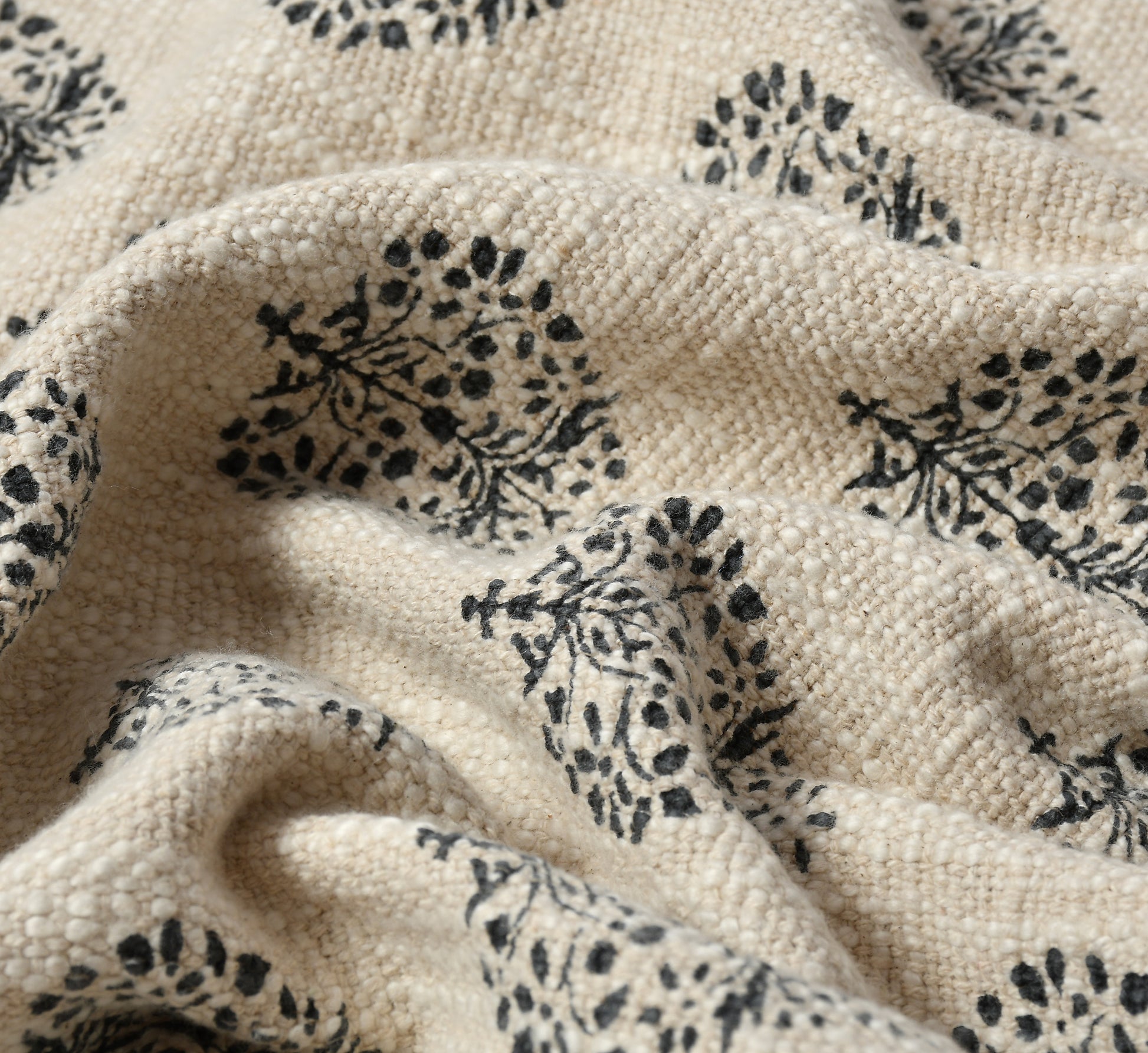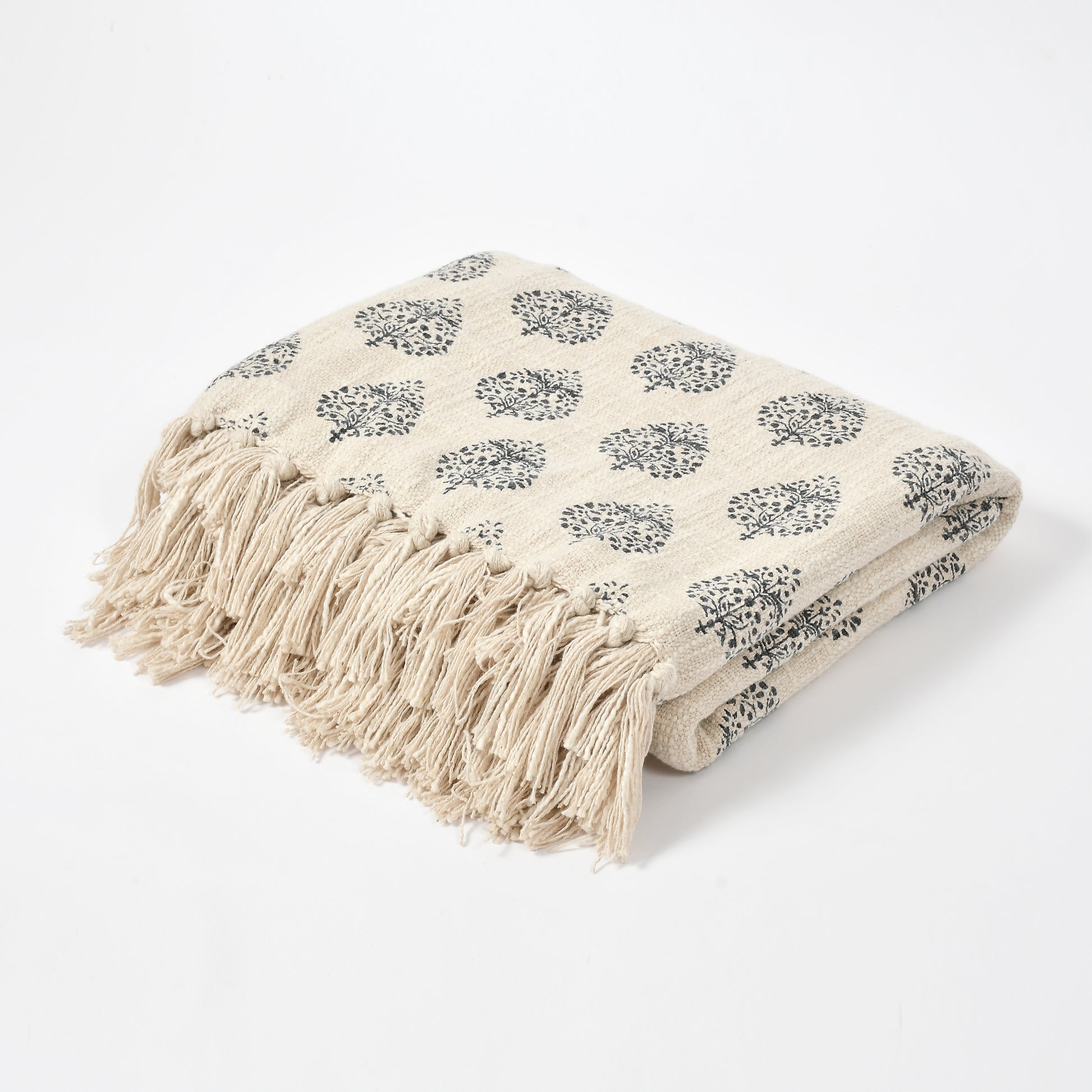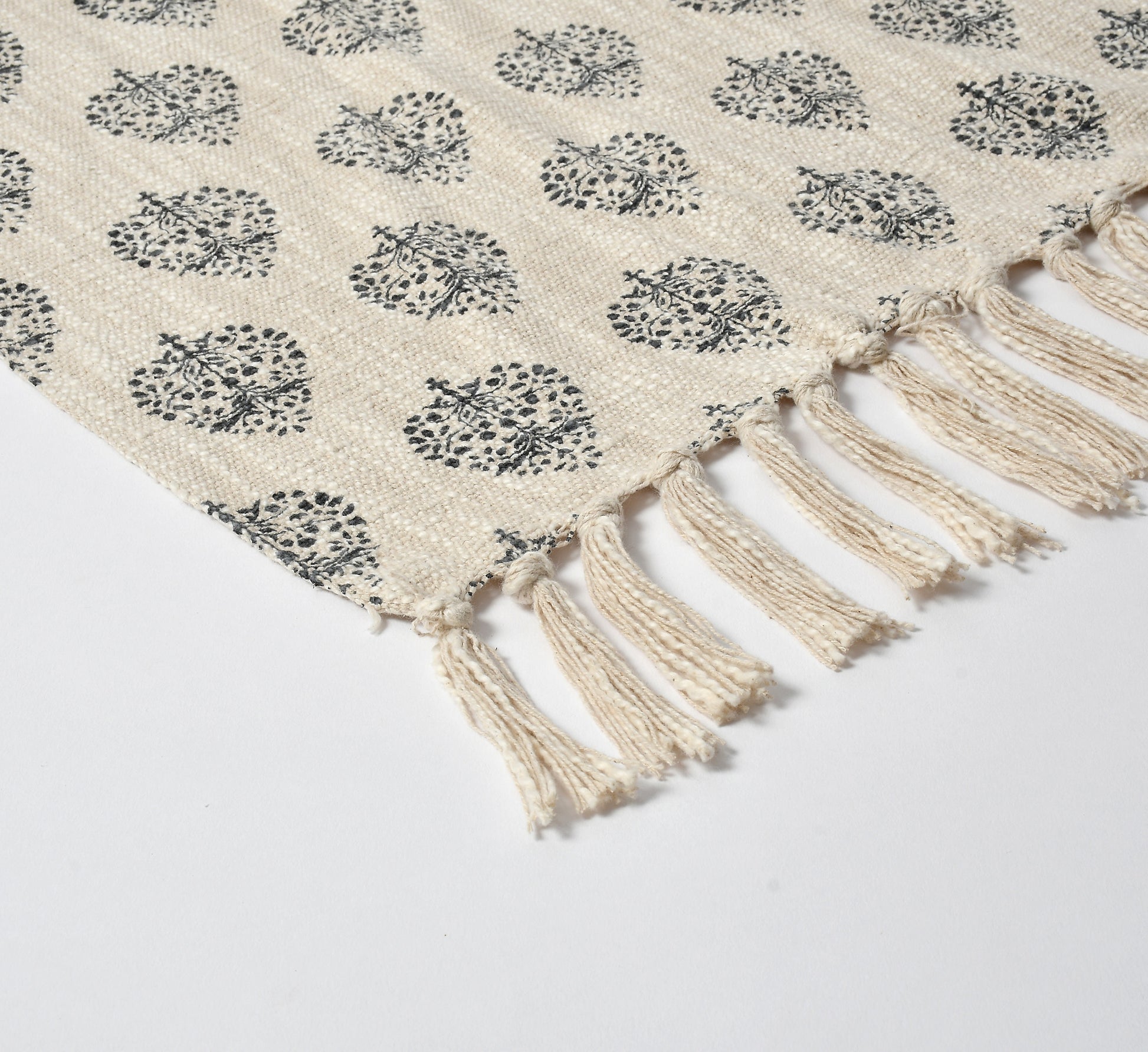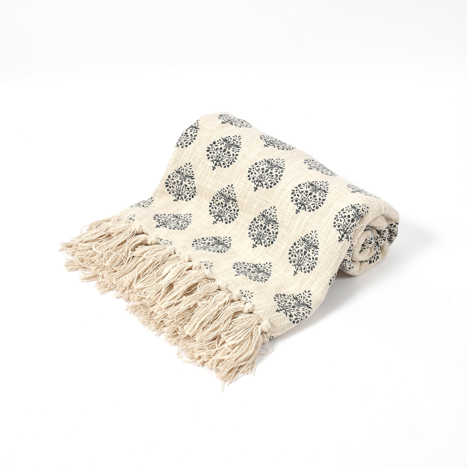 Simple, elegant, and deeply rooted in heritage, the Noor Grove throw blends timeless beauty with artisan charm. Adorned with delicate hand block-printed tree motifs on a warm, neutral cotton base, this piece speaks to quiet luxury. Finished with hand-knotted tassels, it layers beautifully over armchairs, sofas, or beds — perfect for serene moments and restful spaces. A subtle standout for minimal yet soulful interiors.