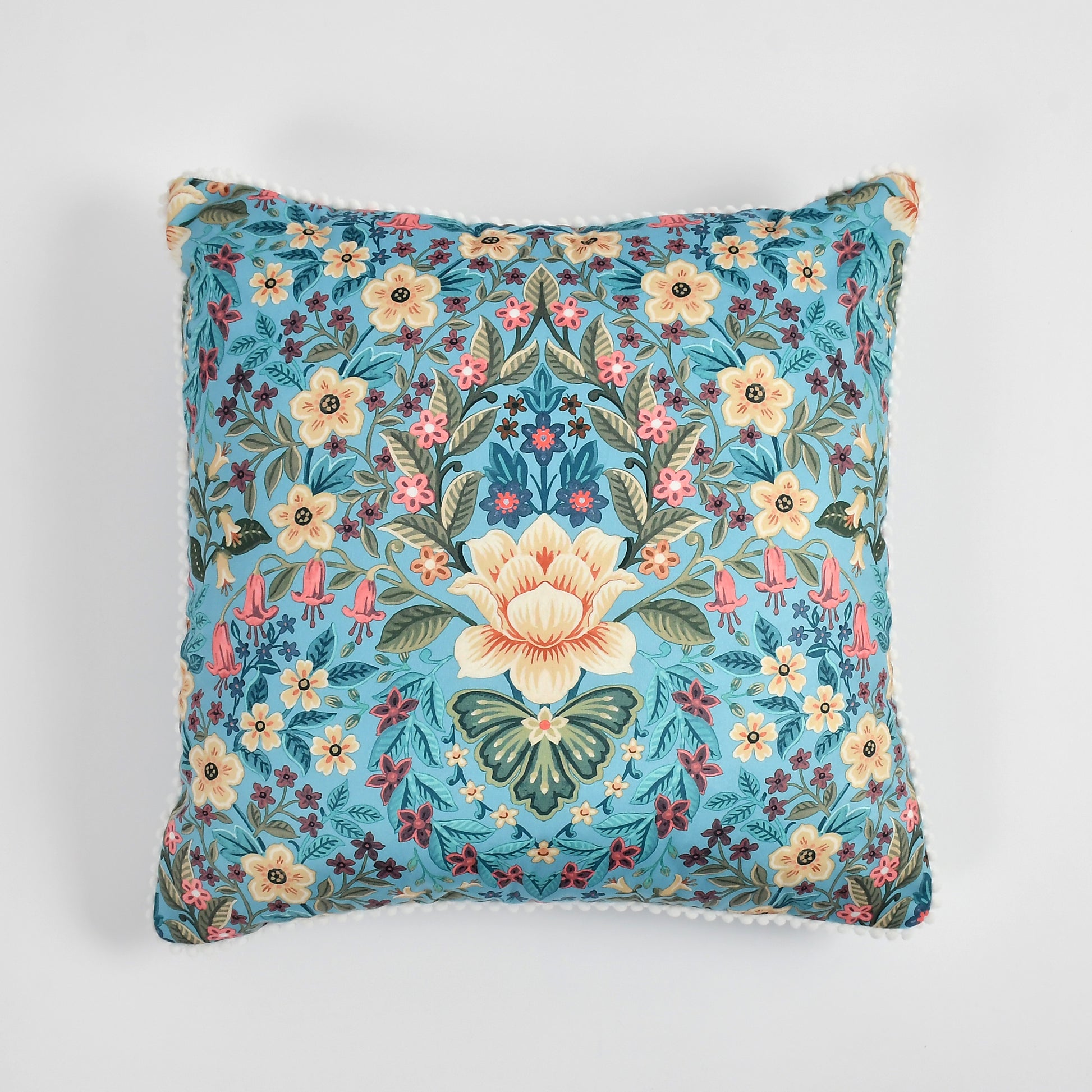 Transport your home to a sunlit wildflower meadow with Meadow Haze, a digitally printed poly velvet cushion cover that captures the essence of timeless beauty and vintage floral charm. Adorned with a symmetrical floral mandala pattern in soft butter yellows, blush pinks, and moss greens on a serene sky blue base, it brings a breath of fresh air into any room.