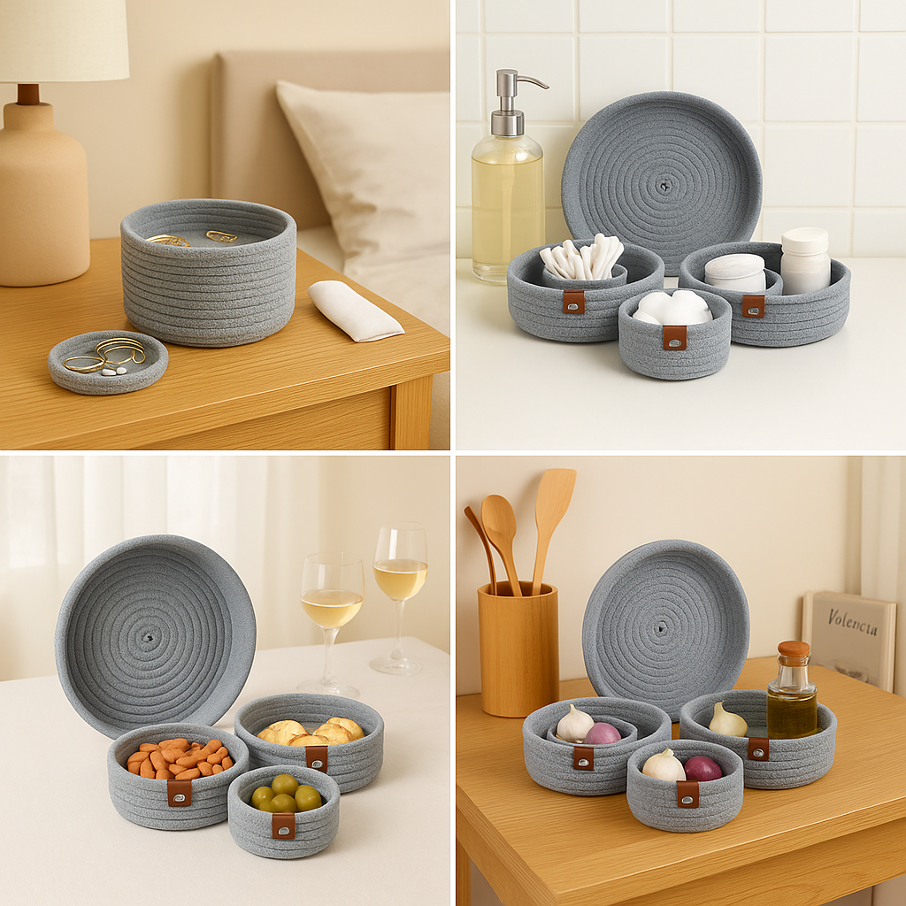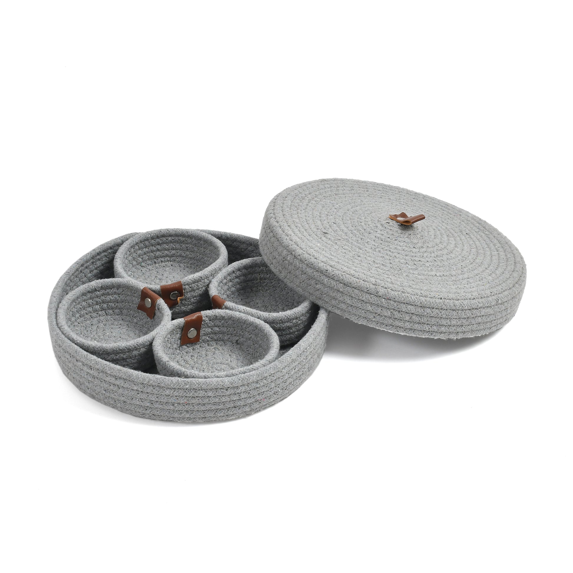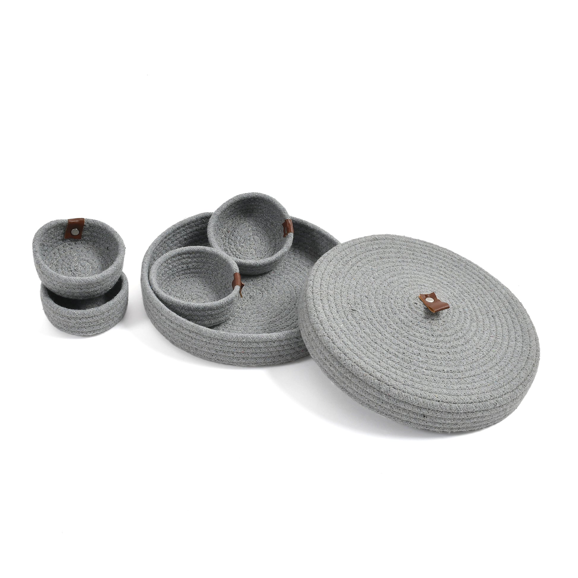 Inspired by the quiet elegance of dusky skies, the Midnight Ash multipurpose basket set brings understated sophistication to your space. Handcrafted from durable cotton rope in a cool ash-grey tone, the set includes five modular baskets — one large base and four removable inner trays — perfect for organizing snacks, jewelry, keys, or vanity essentials. Its soft structure, minimal texture, and modern leather tab detail make it a beautiful accent for living rooms, bedside tables, or entryways.