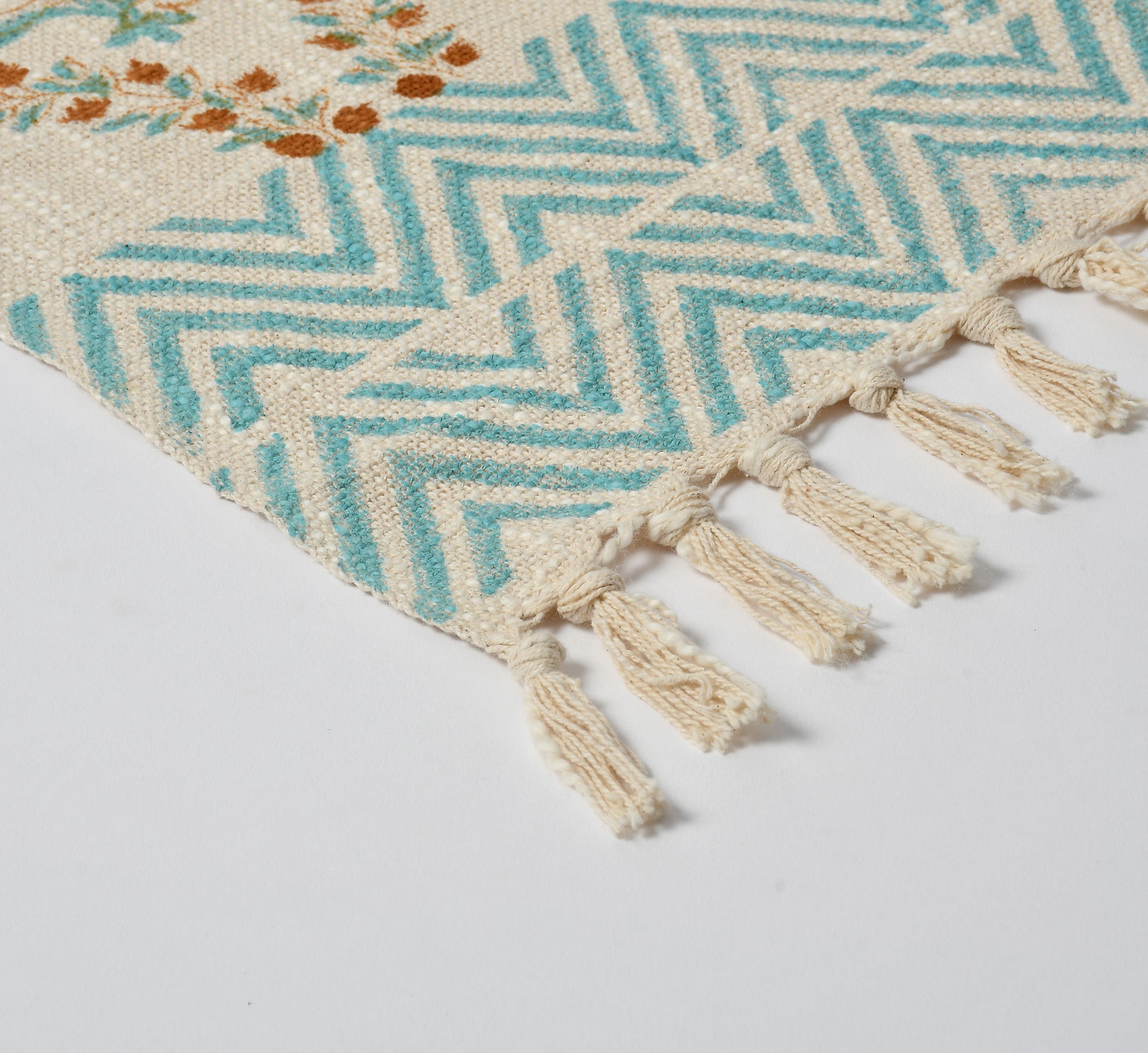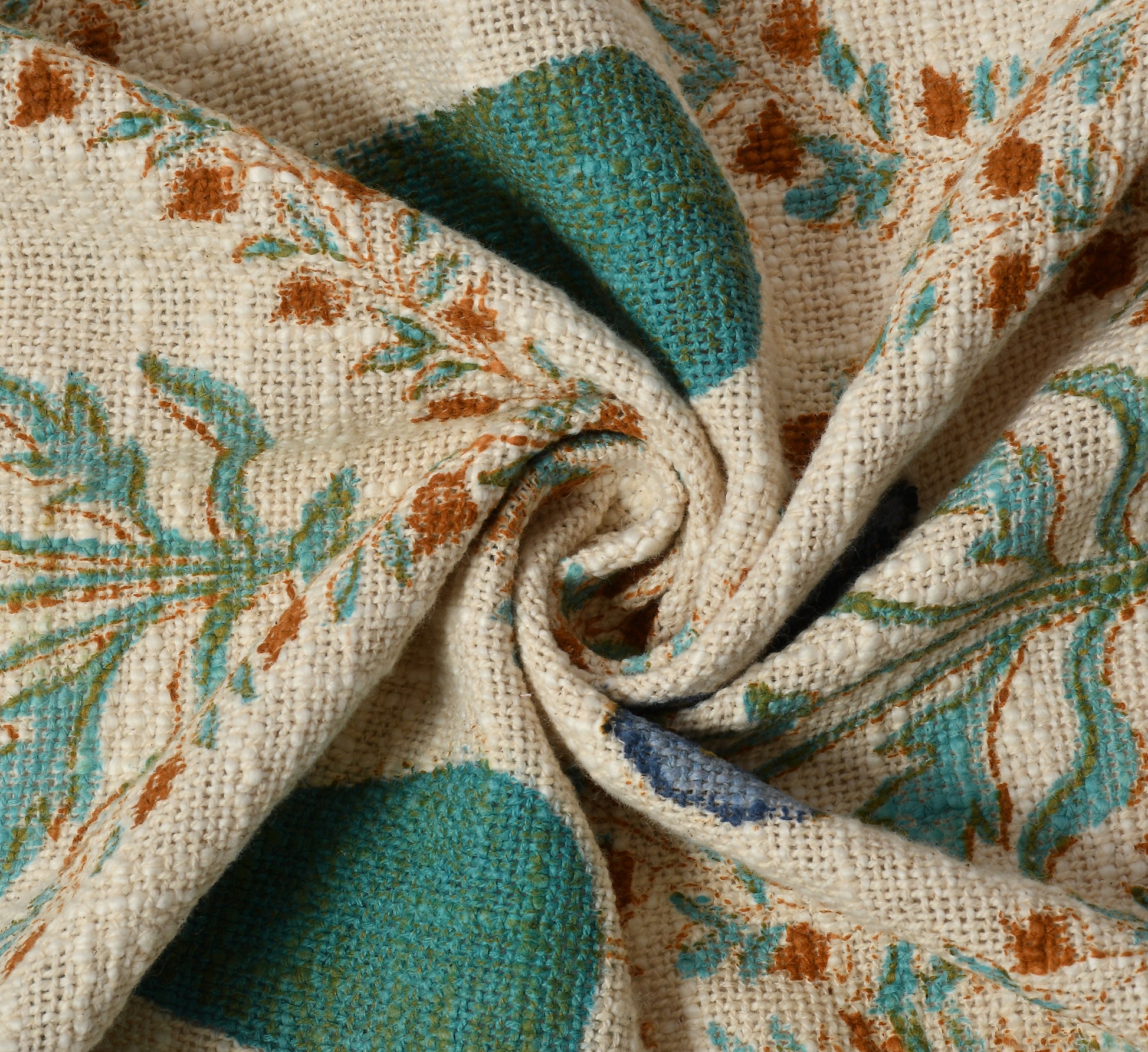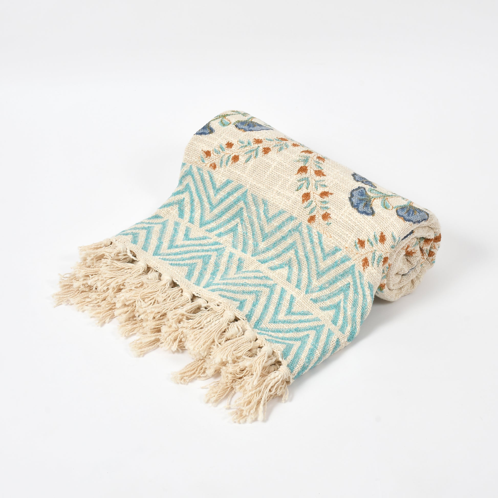 Infuse your space with quiet charm and natural grace with the Teal Bloom throw. Featuring a hand block-printed pattern of delicate teal teardrops and blooming florals framed by earthy vine accents, this 100% cotton throw is a celebration of traditional craft and contemporary calm. The soothing teal chevron border and hand-knotted tassels add a soft structure, making it perfect for layering on sofas, armchairs, or beds. Thoughtfully made to bring everyday elegance to your home.